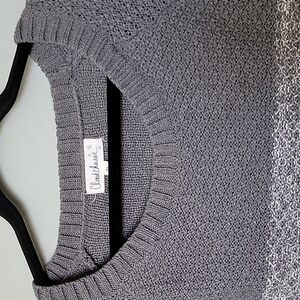 Varying colors of gray. From dark to light starting at the top. Side split hem and high low style. Does stretch. Oversized, could fit up to 1X comfortably in my opinion. It's about a light to medium weight, not chunky at all but doesn't feel super thin either. It's like a comfortable sweater for slightly cold days. Neutral, fall, winter, girly, casual, cozy, lounge,