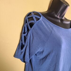 This is a light blue short sleeve t-shirt. The sleeves are open with criss cross detailing.