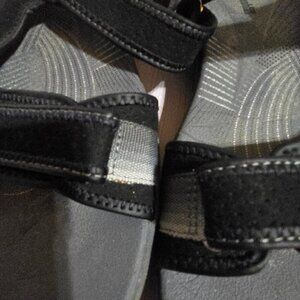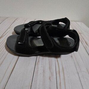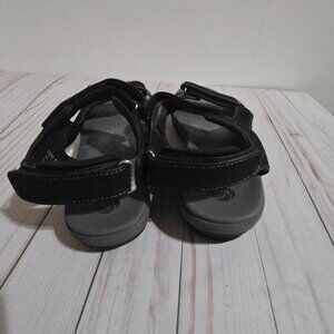 Cloudsteppers by Clarks sport comfort sandals with multiple velcro closures. Color is black with some accents in a variety of greys. Pre-owned in good condition. They've been surface cleaned but could probably use a deeper cleaning but still in good shape.
