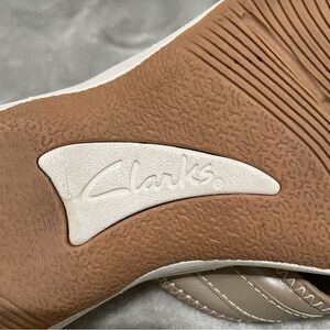 Experience the perfect blend of style and comfort with these Clarks brown sandals. Featuring a chic floral design on the footbed, these sandals are ideal for casual summer outings. The thong-style front strap and additional top strap ensure a secure fit, while the white-edged soles provide a striking contrast. Size 9.