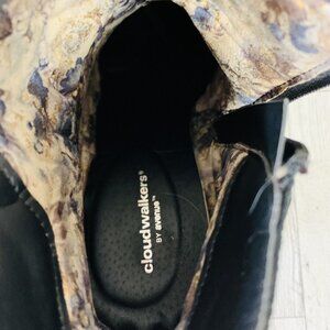 The Cloudwalkers Westside Ankle Boots are a stylish and edgy addition to any wardrobe. These boots feature a closed toe, high block heel, and ankle shaft style with strappy stud and rhinestone accents. The boots are made of faux leather with a wide calf width and zip closure. They are available in size 7W and have a Western, Biker, Grunge, or Cute Goth theme. The Cloudwalkers brand ensures comfort with their Cloudwalkers feature. These boots are perfect for travel, parties, or casual wear in any season.