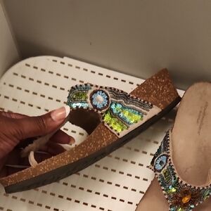 Elegant beaded sandals by Cloudwalkers. Features intricate green and brown beadwork. Perfect for casual outings.