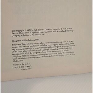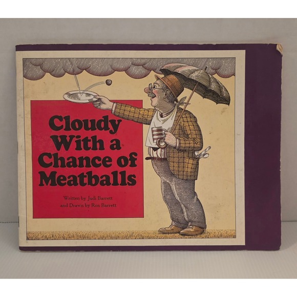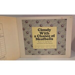 This preowned vintage copy of Cloudy With a Chance of Meatballs is the 1989 Houghton Mifflin edition and remains a classic children's book favorite. The book contains full graphic illustrations throughout, including both black and white and color imagery that brings the story to life. There is writing on the inside first page, which has been noted and reflected in the condition. Aside from that, the pages are clean and intact with no missing content. The binding is solid and all pages are present. The outer edges show some wear and light bending consistent with age and normal use, but the book still displays well and reads beautifully. This is a great vintage copy for collectors, fans of classic children's literature, or anyone looking to add a nostalgic favorite to their library. Please review all photos carefully to assess condition details before purchasing
