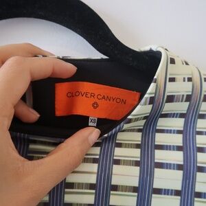 A structured neoprene-like top featuring Clover Canyon’s signature digital print. The body showcases a high-rise building facade motif in geometric yellow, green, and navy tones, while the sleeves contrast in a multicolor glitch plaid with sky-blue accents and bold side stripes down the arms. Back zipper closure.