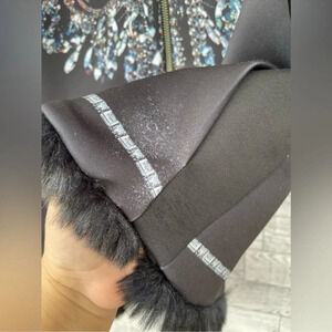 In good condition reversible chandelier print in one side faux fur in the other side color of fur blue black has spandex