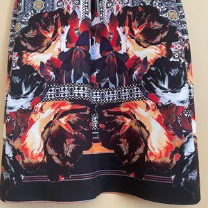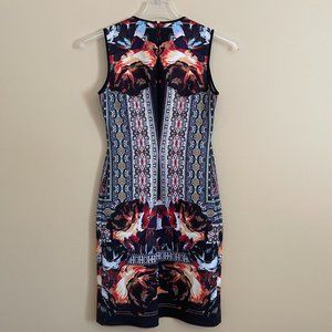 This gorgeous Clover Canyon dress is gently used, please see the photos. Lush flowers bloom over the border prints patterning a densely knit, super-stretchy sheath dress that hugs and highlights your curves.