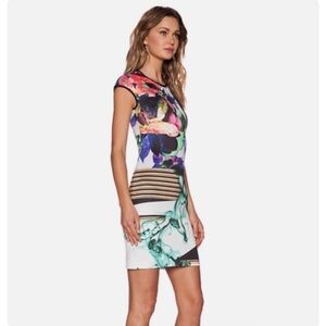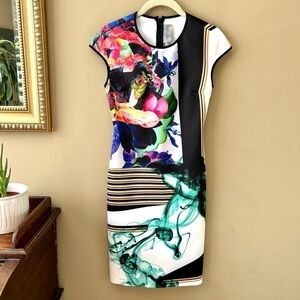 This Cap-Sleeve Liquid Jade Sheath Dress from Clover Canyon features a stunning floral print, short cap sleeves, a fitted bodycon mini silhouette with a rounded neckline, and concealed back zip closure. This scuba neoprene fabric. 90% Polyester, 10% Spandex