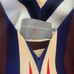 This Clover Canyon is a sleeveless top with vertical stripes. The top features dark blue, brown, and red vertical stripes outlined in white. These stripes converge toward the center, creating a V-shaped pattern that draws attention to the waistline. The plunging neckline adds a touch of elegance, and the fitted design accentuates any shape.