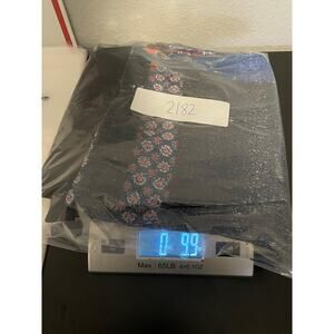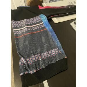 Color/Pattern: Black with multicolor digital/abstract floral print panels (blue, pink, mixed motifs)