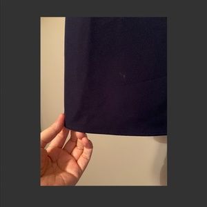 Off-the-shoulder / strapless navy blue swing dress with big pleats on back and self-tie bow detail from Clover and Sloane. Very small spot on front of dress. Polyester. Machine washable.