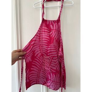 Girls, pink and dark pink leaf pattern apron, fits approx sizes 2 to 8, clover mamas, 100% cotton, ties in back, pocket in front. Total length from top to bottom is 28 inches with straps, length of the actual apron panel is 20 inches.