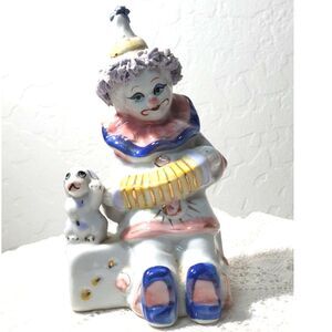 The clown are designed in a vintage style, possibly from the mid-20th century, a period when porcelain clown collectibles were popular.