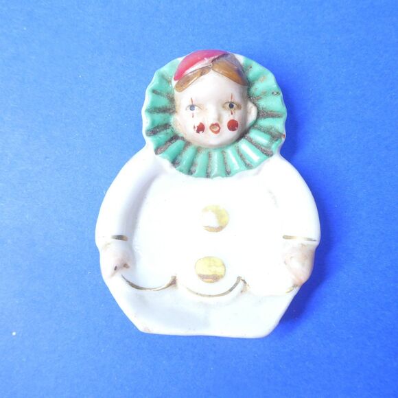Vintage porcelain spoon or tea bag rest shaped like a clown. It is about 3 inches long, and made in Japan. Good shape overall, some paint wear, with no chips or cracks.
