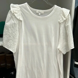 like your favorite tee only way prettier features crisp eyelet sleeves and dainty ruffles. Faded jeans and pencil skirts work equally well with this silhouette