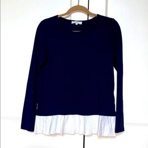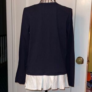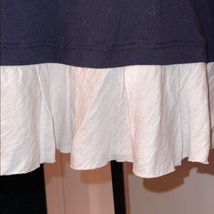 Clu Too navy blue 100% soft cotton l/s t shirt with white crinkled ruffle rayon hem. Size is small. Great condition - worn a couple of times. No rips or tears or stains.