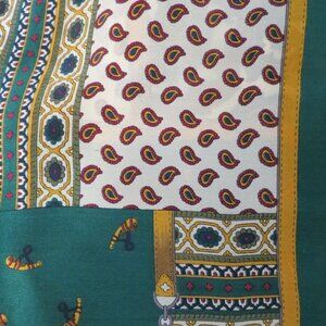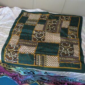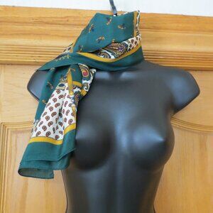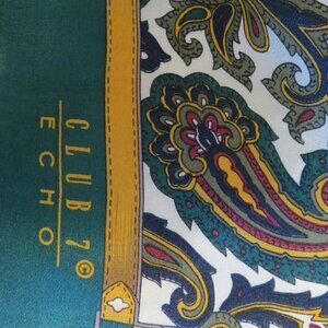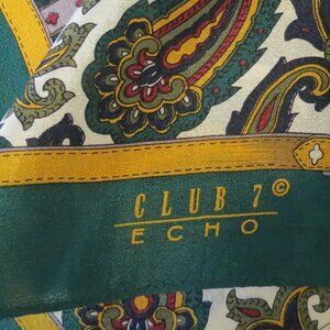 Fashionably elegant, Club 7 Echo scarf, 30.5W X 31”L, it looks like silk, feels like silk, but I cannot confirm that it is silk because I am not an expert, unfortunately the tag was removed. This brand: Club 7 Echo scarves are usually 100% silk, no rips or tears, excellent condition, like new, professionally dry cleaned.