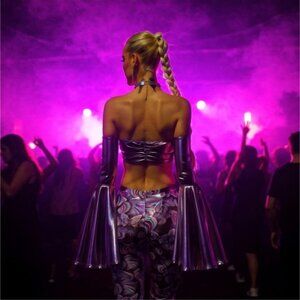 The “Luminous Love” tube top from Club Exx features a lilac metallic stretch with ruched front and back, off-shoulder long bell sleeves, and a fitted silhouette that channels futuristic ravewear with coquette softness.