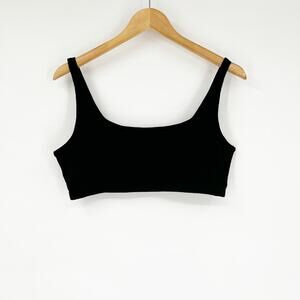 Black athletic crop tank with rhinestone 'play' text graphics on the front by Club Exx.