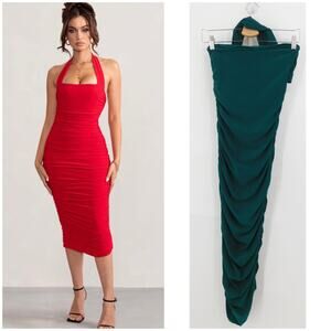 Club L London Letitia Green Halter Neck Ruched Bodycon Midi Dress Size 2