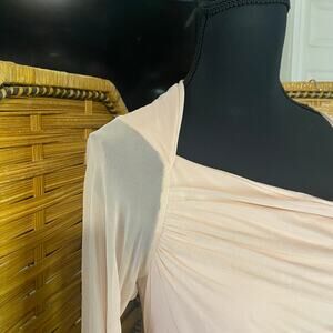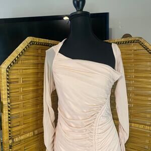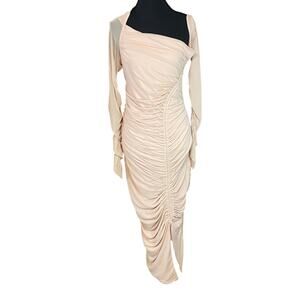 Elegant Club L London blush pink bodycon midi dress featuring dramatic ruching throughout for a flattering fit. Designed with sheer mesh long sleeves, an asymmetrical one-shoulder neckline, and draped fabric accents for a modern, romantic look. Side zipper closure, fully lined for comfort. Perfect choice for cocktail parties, weddings, date nights, or special occasions. Size US 6 / UK 10 / EU 38. Made in the UK. Fabric: 95% polyester, 5% elastane.