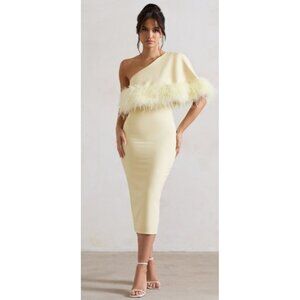 Club L London Victory | Lemon Asymmetric Midi Dress With Feather Trim Size US 8