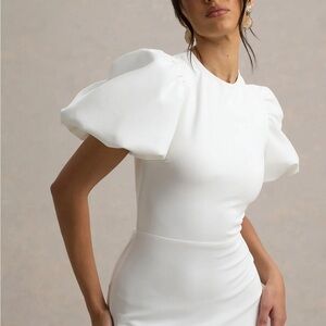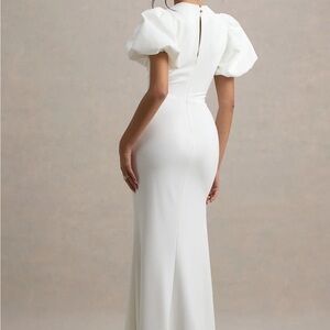 Chic white maxi dress with elegant puff sleeves. Perfect for special occasions. Flattering silhouette.