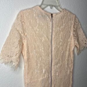 Sweet and dainty this Club L light pink/peach lace dress is sure to impress. Features round neck short sheer sleeves, fully lined. Gorgeous Chantilly lace with frayed hem on sleeves, skirt and waist line. Exposed zipper up back. Perfect for brunch, church or a sweet date night! In excellent condition. Size EU 36 US S