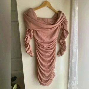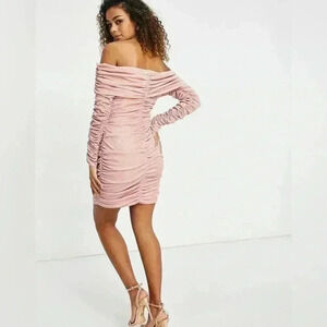 Club London Long Sleeve Bardot Off Shoulder Ruched Mini Dress Pink Bodycon Sexy