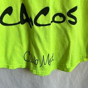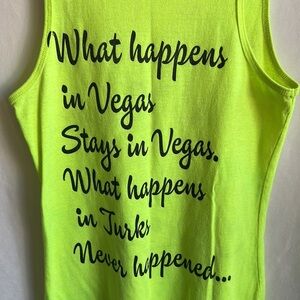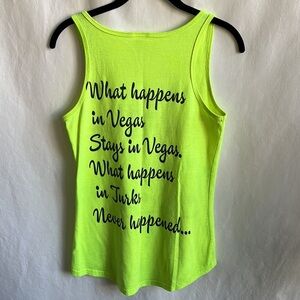 Club Med Port and Company Twerk & Cacos neon yellow-green tank, size S. Good preowned condition. Back says “What happens in Vegas stays in Vegas. What happens in Turks never happened …”