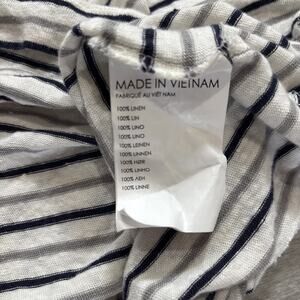 This is a Club Monaco 100% Linen Striped Long Sleeve Tee; Featuring a relaxed fit and a round neckline, this t-shirt is perfect for casual occasions or travel. The white color and striped pattern add a classic touch, while the long sleeves and jersey fabric make it comfortable for all-day wear. With side slits and a pullover closure, this tee is both fashionable and easy to care for with its machine washable design. Perfect for the warmer seasons of summer, fall, and spring, this Club Monaco tee is a must-have for any fashion-forward woman.
