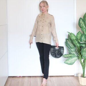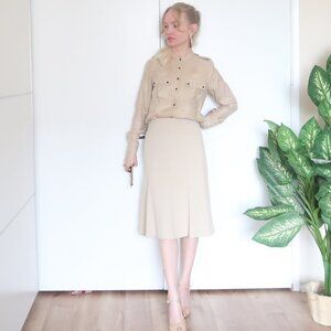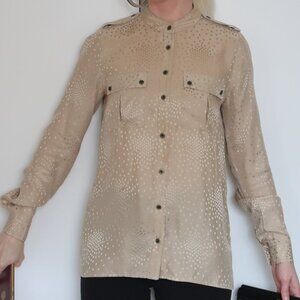 Gorgeous Club Monaco 100% silk blouse top in beautiful cream / tan / beige. Suttle same color polka-dot print. Long sleeves. Two pockets on the chest. Perfect for a hot summer day or wear with a blazer in autumn / winter season. A wardrobe staple that will make your every look classy and sophisticated.