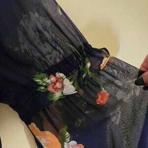 Elegant floral dress with long sleeves, perfect for transitioning between seasons. Features a flattering ruffled v-neck and a comfortable Smocked Waist, Sheer ruffled balloon sleeves, designer. Retail $249