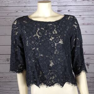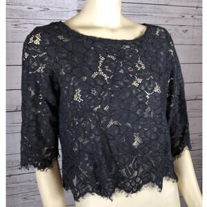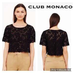 Club Monaco Black Lace Cropped Top scalloped hems back button closing size small