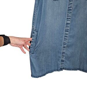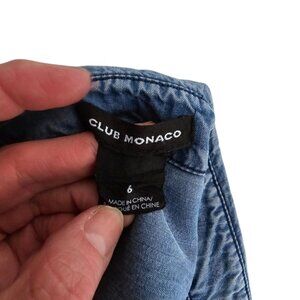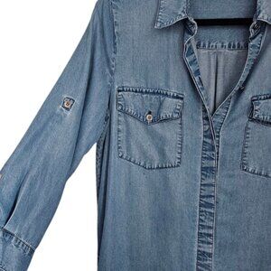 Stylish Club Monaco denim shirt dress with a button-down front, chest pockets, and side pockets. Buttons on the sleeves allow for rolling them up. Perfect for casual outings or office wear; dress it up with accessories for a night out.