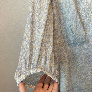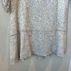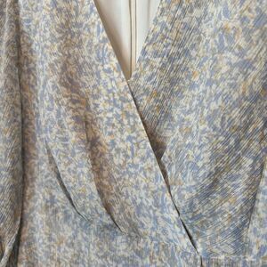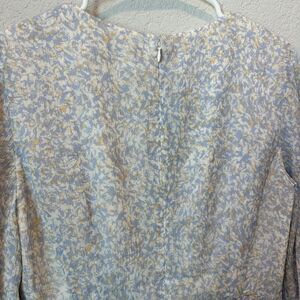 Features: cotton/silk blend, surplice neckline, 3/4 length sleeves with elastic cuff, fully lined, small ditzy floral, subtle ruffle hem