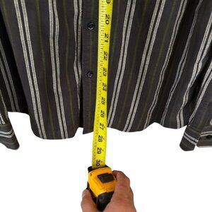 Classic and versatile, this Club Monaco men's button-up shirt in size XL features a stylish striped pattern in black, gray, and green tones. Made from 100% cotton, it's perfect for casual or smart-casual wear year-round.