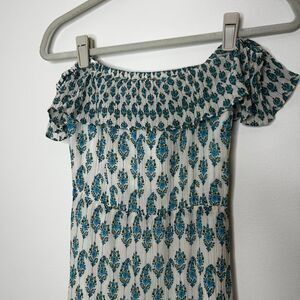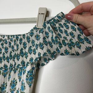 An off-shoulder Club Monaco dress with an antique-inspired floral pattern. Covered elastic at the ruffled neckline and waist. Lined