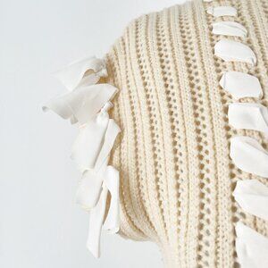 A lovely, feminine sweater for all your spring events. Medium-weight cotton knit with lengths of white woven into the fabric ending in streamers at the hem and sleeve.