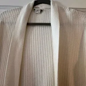 Club Monaco open-front cardigan in a soft cream ribbed knit. Lightweight and versatile for layering. Long sleeves with a relaxed fit. Neutral hue pairs with many outfits.