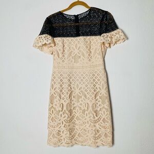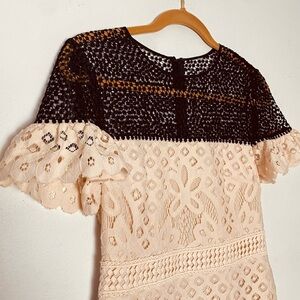 Elegant lace mini dress. Features cream body with black lace overlay. Short sleeves with delicate detailing. Perfect for any occasion.