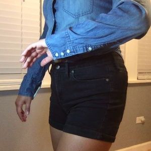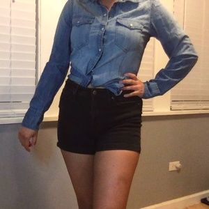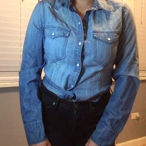 Cute Denim Button Up with pearl like buttons. The button are like snapped on. Its a mixture of a light and dark wash. In excellent condition, with a bit of wear. 100% Cotton.