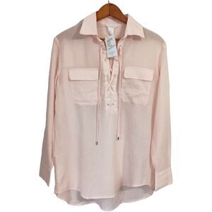 The Club Monaco Gauzy Cotton Top in size small is a relaxed and lightweight pink blouse perfect for various occasions including travel, weddings, parties, casual outings, and formal events. This collared top features a lace-up closure, long sleeves, and a tunic style fit. Made of woven cotton fabric, it is easy to care for and breathable, making it suitable for all seasons. With a minimalist and old money vibe, this top is ideal for those looking for a quiet luxury piece with a touch of art and preppy style.