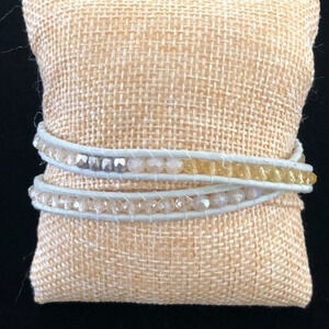 Details: Shorter length wrap style bracelet. Light gray leather with clear yellow and gray faceted beads. Silver hardware