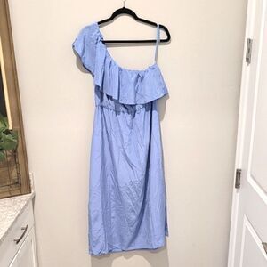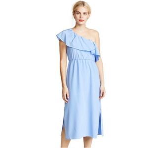 Club Monaco Hanitah, Spanish sea bleu silk dress. One shoulder ruffle dress, elastic waist with dual side slits.