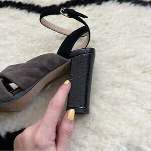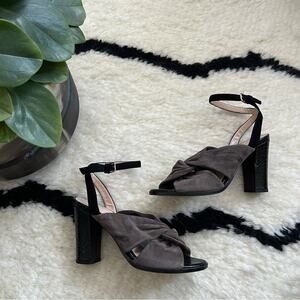 In good preowned condition other than a small nick/flaw in one of the heels. Black embossed leather with grey suede. Adjustable ankle strap.