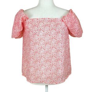Club Monaco Malaina Blouse Size 8 Red White Puff Sleeves On- or Off-the-Shoulder. Blouse is in good preowned condition. One of the interior hanging straps is missing. Papaya red and white allover print. Cupro and nylon blend with a sheen. Fully lined. Dramatic puff sleeves can be worn on or off the shoulders. Square neckline. Elastic around sleeves and back of neckline.