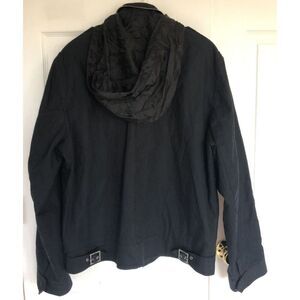 Inner zip pocket, hidden hoodie. Color is black with tiny metal dots(see last picture). See measurements, it seems run smaller than size on tag. Excellent condition