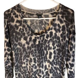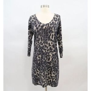 Club Monaco Leopard Print Sweater Dress, XS. Black and cream animal print 95% wool, 5% cashmere. Supersoft, cozy! Scoop neck, pullover. Long sleeve, mini. Up your winter game. Flat lay 38”L, 19”P-P. #mobwife #carmellasoprano #leopardprint