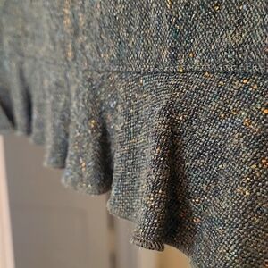 Elevated and timeless, this Club Monaco Wool & Silk Tweed Pencil Skirt features a flattering fishtail back ruffle and feminine banded waist. The olive/army green tweed shifts beautifully in the light with subtle flecks of brown, rust, and blue. A rare piece that exudes both classic 1940s military-inspired tailoring and modern polish — perfect for work, academia, or evenings out.
