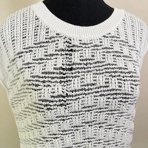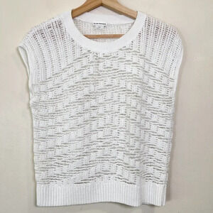 WHAT:   Open knit cardigan vest. Crew neck. Ribbed collar and hem